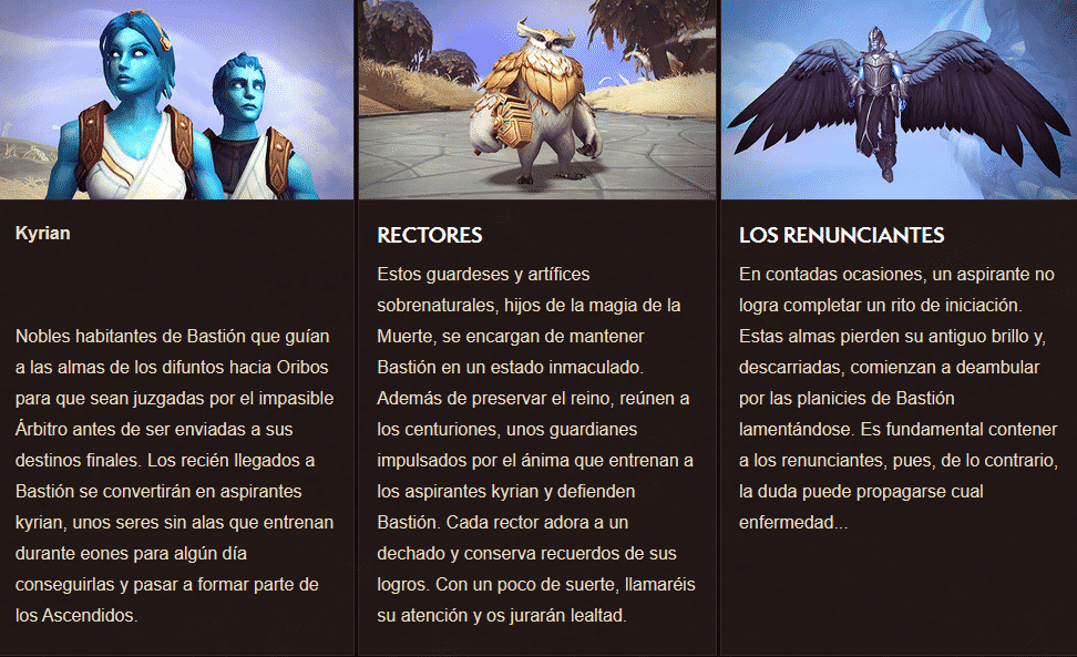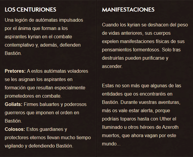 En Bastión hay más misterios por descubrir, pues allí no todo es lo que parece y una fuerza siniestra amenaza con destruir la paz del reino. ¡Puede algunos de los mayores héroes de Azeroth puedan defender la causa de los kyrian y repeler a sus adversarios!